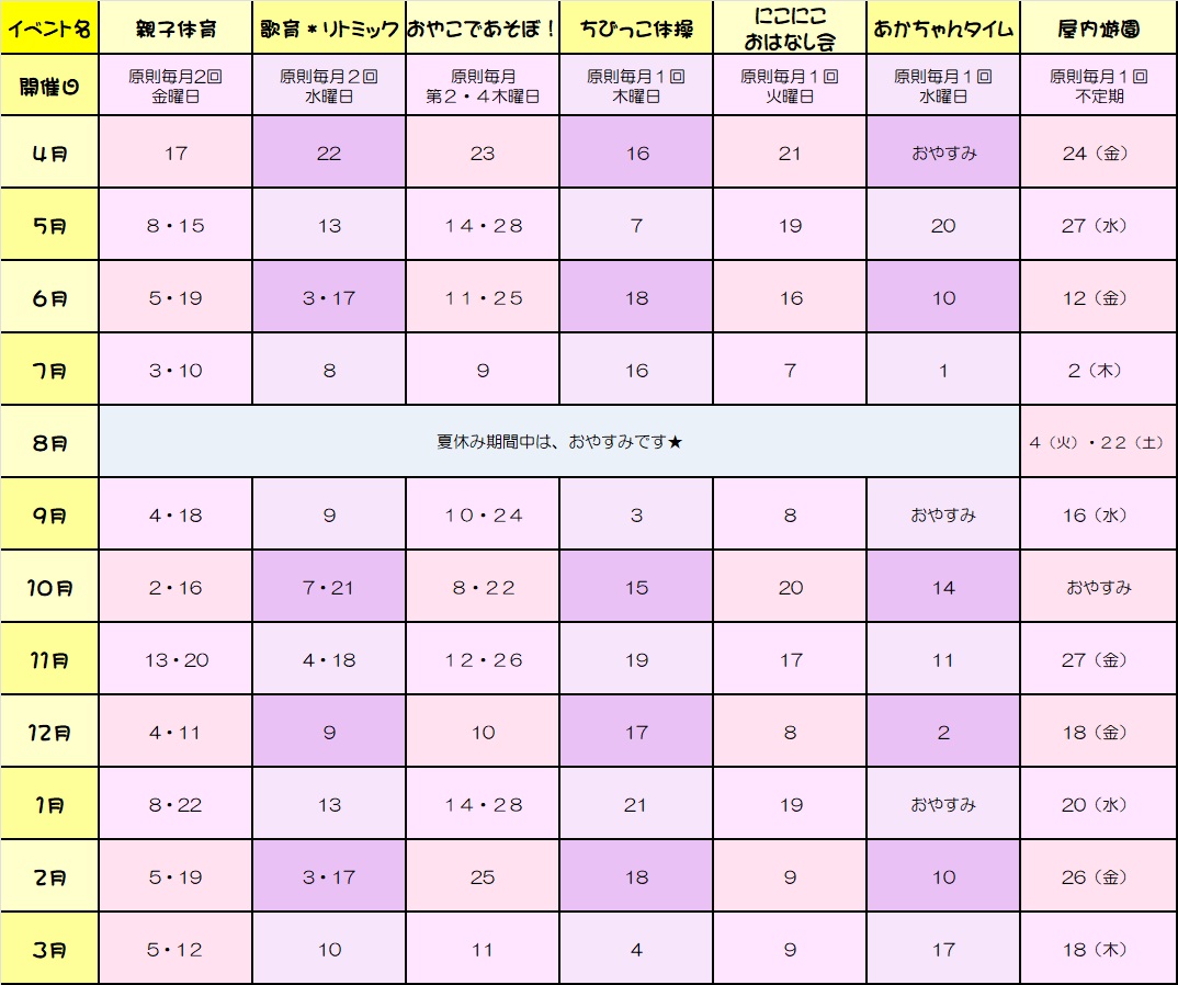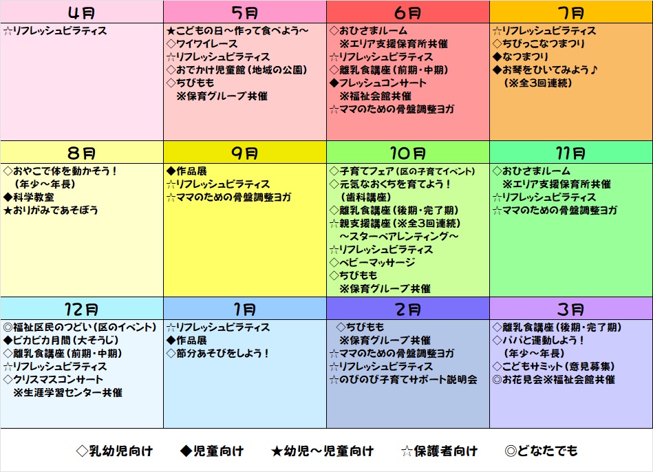 ★日程や内容等は都合により変更する場合がありますので、ご了承ください。 ★暴風警報が発令されているときは、すべての事業が中止となります。 ★詳細は、じどうかんだよりのページもご覧ください。 ★開催中は、危険のないよう保護者の方のご協力をお願いいたします。